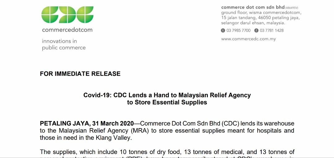 Covid-19: CDC Lends a Hand to Malaysian Relief Agency to Store Essential Supplies